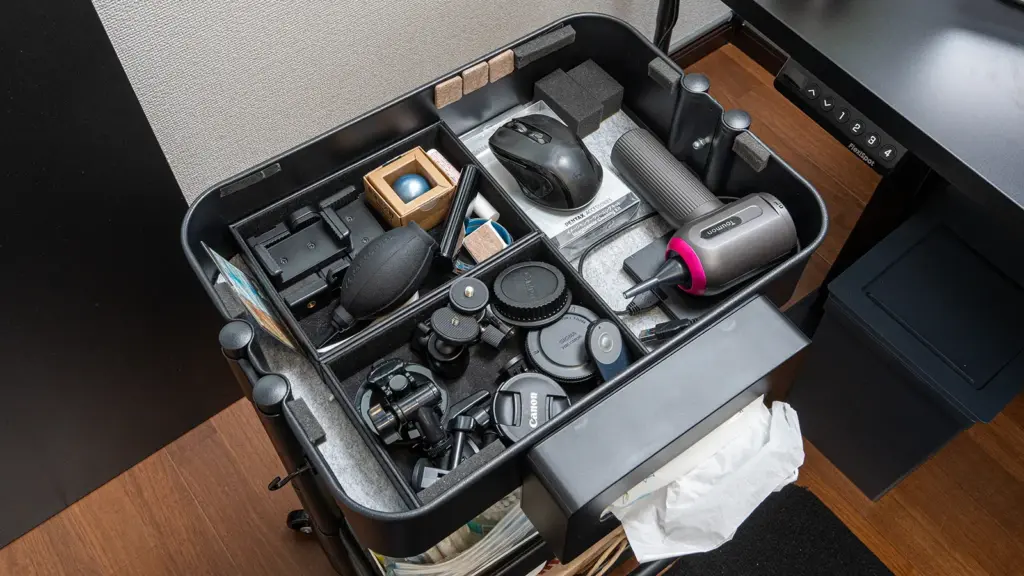 ケーブルやメンテナンス用品など、頻繁に使う小物をまとめるのに便利なアイテムです。
