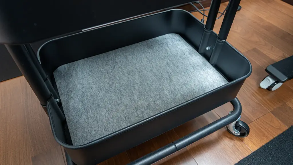 100均で少し磁力の強いマグネットシートを買って裏に貼り付けて、サイドワゴンに固定しています。
