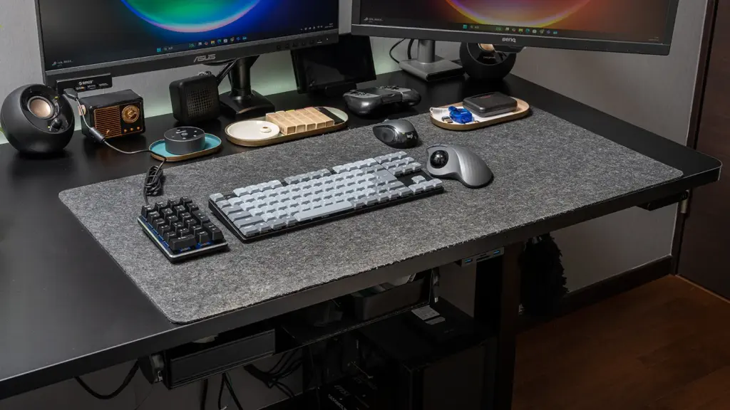 Flexispotのメラミン天板 ブラックにはダークグレーがおすすめです。マットが主張しすぎず落ち着いた雰囲気になります。